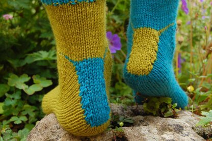 It’s my experience that all sock knitters love a new heel to try! My variation on the much-loved Fleegle heel has a neat rectangular gusset at the back of the heel for a really good fit. I’ve created this version in simple blocks of colour to allow you to see the construction at a glance. But worked on a striped sock, with the heel turn worked in whatever colour happens to be up at that point, you get a very cute boostrap effect.