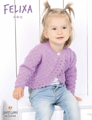 Felixa is a modern bolero with a lacy trim. Any DK weight yarn can be used. The pattern is sized for 0-11 years