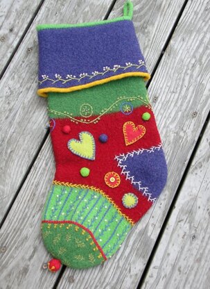 The crazy quilt holiday stocking pattern makes a large felted stocking with a simple folded cuff. The finished size is about 8-inches wide by 22-inches high after felting. The size lends itself to endless embroidery and embellishment just like the crazy quilts of long ago.