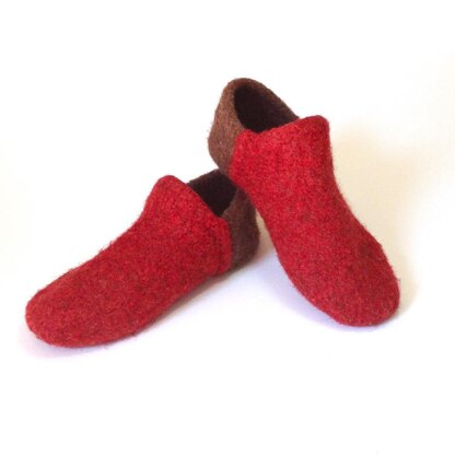 Beginning with the heel portion in Color A, slipper is worked flat to create the back of the foot and heel. Stitches are then picked up in Color B and the rest of the slipper is worked in the round to the toe. Small bits of German Short Row are used for a more refined fit, and the toe is closed with Kitchener Stitch.