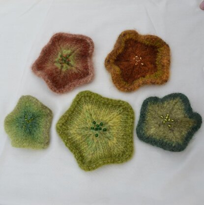 Each year, I design a new Holiday ornament. This year, I have enjoyed working with Noro Kureyon and experimented with using feather and fan lace pattern in a circular design to create these lovely felted star ornaments. After felting you can often see a few specks of light in the center of the star. A few glass beads are sewn into place after felting to add accent. I have made over 50 of these ornaments and no two are identical. They are wonderful for creating a color theme of ornaments for your tree with still keeping each one interesting and unique. Stars in photo are shown in both lightly and heavily felted styles. Finished size is 3-5 inches. Yardage of 15-18 yards per ornament.