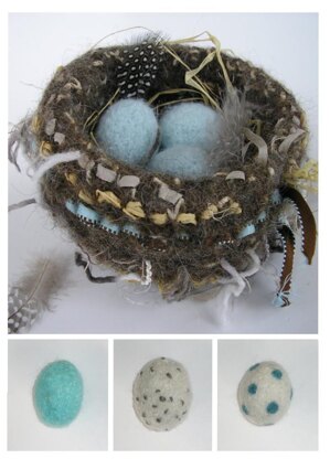 Knit a life-like nest using earthy color yarns and raffia or a whimsical nest using bright colors and exotic novelty yarns and ribbons. Fill each nest with speckled or, even, polka dotted eggs. Have fun thinking like a bird. The skies the limit!