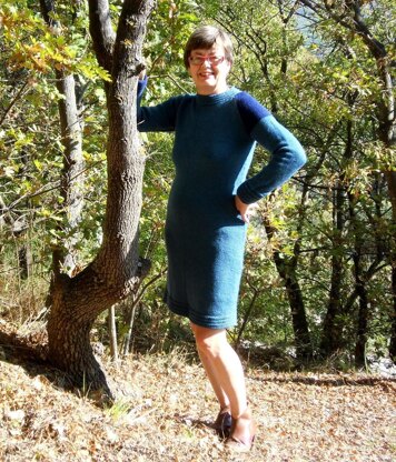 A plain knitted (stockinette) woollen dress in a comfortable design with raglan-type sleeves and for the bottom of the dress, the cuffs and the collar we have made a furrow-textured knitting. The dress fits without being tight. Worked flat. Well written pattern with chart for the furrows. Added on a little twist of a tip colour, as on the photo, the model becomes even more particular. But self-coloured it is also elegant and chic. Inluded in the pattern comes also the pattern for the more bulky bouclé type for needles no 5 mm. Difficulty of execution measured from 1 (beginner) to 5 (advanged): 2-3.