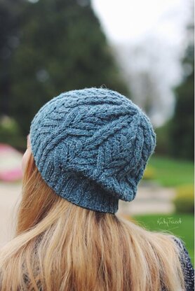 The textured lines of this slightly slouchy beanie with a touch of lace are meant to evoke a field of ferns that carpet the forest floors. The hat is worked in the round from the bottom up and given in four sizes to fit children and adults.