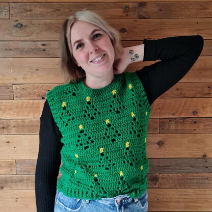 The Festive Firs Vest is a really fun and super cute crochet Christmas cover up. Perfect for those in warmer Christmas climes or who get a little toasty when roasting those potatoes.