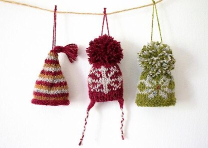 The green hat is knitted using the Fair isle technique, the red one uses the Swiss darning technique to embroider the snowflake and the pixie one is knitted in charming stripe sequence.