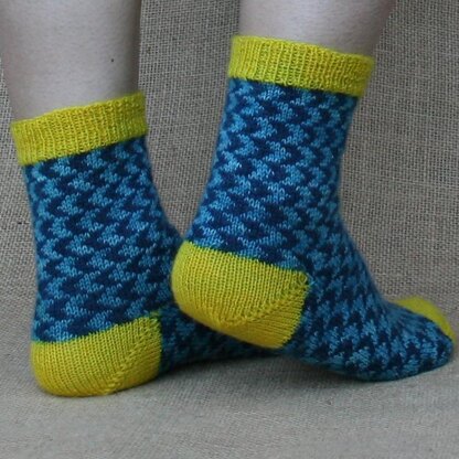 Worked from the top down with a short row heel, colourwork gives these socks a wave pattern around the leg and foot. The first sock has chevrons flowing in one direction for the flood (rising) tide, the direction of the chevrons is reversed for the second sock to represent the ebb (receding) tide.