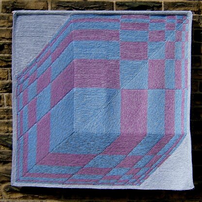 Fibo-optic uses the Fibonacci Sequence in two directions, in each of the three dimensions, to give the illusion of a large flying cube. Although it is primarily intended as an afghan, it is ideally suited to being used as a wall-hanging or floor rug, where it can always been seen spread out.