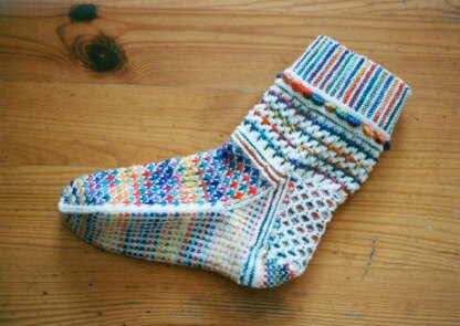Description The most exciting socks you will ever knit or wear. Designed for knitters with a low boredom threshold. Don't worry about the length of the directions, nothing has been omitted. The sideways cuff will act as your gauge swatch and determine the size of the sock for you. Take the knitting one round at a time and have fun! Knitted cuff-down with a variegated and solid sock yarn.