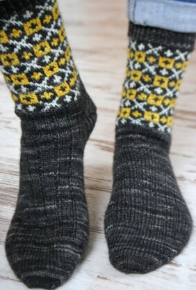 Filisur is colowork fun in rounds! I designed these socks with a relaxed fit. They are perfect chill out partners. These socks are knitted from the cuff down. After the ribbed cuff you work the colorwork part with 2 contrasting colors. You can knit your favorite heel, or if you wish to make mine, follow the instructions for the ribbed heel flap. On the foot the ribbed pattern continues, ending up with classic toes.