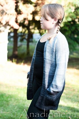 Film Reel cardigan is designed to showcase gradient yarn sets or your favorite colors together. It is shown here in the Film Noir gradient. The cardigan is worked top down. This design features a clever use of woven stitch to create a subtle colorwork effect. The use of short rows and slipped stitches makes this design suitable for the advanced beginner-intermediate knitter.