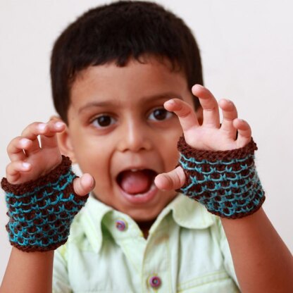 The gloves in the picture are made using Knit Picks Palette in Bark (brown) and Pool (blue) colorways. The mitten in Small size is modeled by a 4 year old.