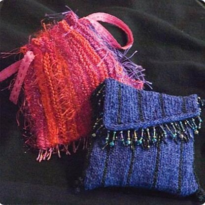Gathering Bag (Fuschsia) Size: 7.5" wide x 6.5" high Gauge: 5 sts/inch in stockinette Needles: US 5/3.75 mm Materials: 80 yards basic yarn, 160 yards novelty yarn, 8" beaded ribbon trim 1/2" ribbon 30" long