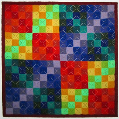 What you see first will probably depend on the colours you choose. I tried to find 16 colours to form a ‘rainbow’. You can see them along the sides. You don’t have to use these colours but you should choose 16 noticeably different colours. Another colour is needed for the border. As with all Woolly Thoughts afghan patterns there is a colouring sheet for you to plan your colours.