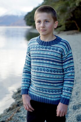Mountain hiking and skimming stones call for a warm sweater on a winters day. This three colour sweater is worked in stripes with simple triangles and diamonds to create an interesting pattern. Modified drop shoulder detail and crew neck made this an easy knit.