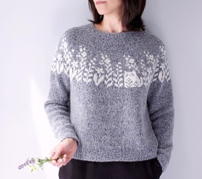 Inspired by the little feline visitor in my garden, the Fiona sweater portrays the charming picture of the adorable kitty in the company of beautiful blooms. The slightly cropped sweater is worked seamlessly in the round from the top down, and has short-rows to raise the back neck for a comfortable fit. Be it with a dark or light background color, this gorgeous stranded colorwork sweater is equally striking and delightful to knit and to wear.