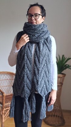 Wrap yourself in cozy elegance with this textured chunky knit scarf! Featuring a chevron pattern in a ribbed version and playful tassels, this design is perfect for adding warmth and style to your wardrobe. Inspired by forest paths among fir groves, this oversized scarf can double as a chic wrap. The pattern includes written instructions, a chart, and links to supporting videos.