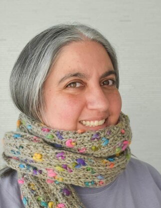 A simple stitch and a textured yarn combine to add pops of color to a cozy accessory.