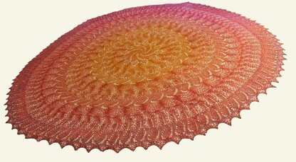 This is an ornate lace shawl suggesting the swirling flames of a bonfire. It is heavily beaded, though the pattern is not carried in the beads. Use 8/0 beads for laceweight yarn, and 6/0 beads for fingering weight yarn. Use a US 3 needle for the lace weight, or a US 5 needle for fingering weight, adjusting needle size to suit your taste and knitting style.