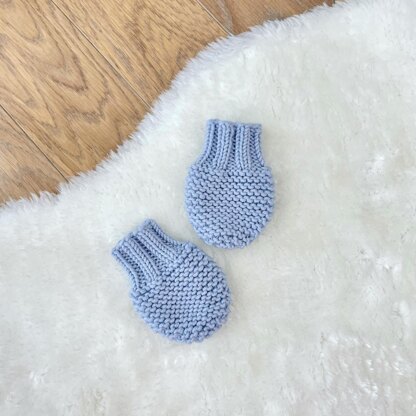 These thumbless mittens are worked in the round. Instructions are provided for knitting in the round using either double pointed needles or circular needle. Five sizes Doll/Premie/0-3m/3-6m/6-18m are available with a measurement reference table.