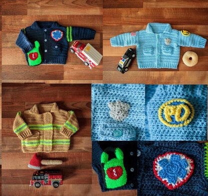 Sport weight/baby weight yarn Size F and G crochet hooks Yarn needle Fiberfill Zipper and Velcro for firefighter's sweater and buttons for EMT and police sweaters Rattle insert