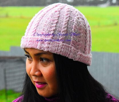 This stylish Beanie is knitted down to top in a round using cable knitting technique and 5 DPN needle/ circular needle size US 9 (3.75 mm). The pattern consists of 4 rows that knitted repeatedly and used around 200 grams of DK Wool. The beanie is quite stretchy and have beautiful round top.