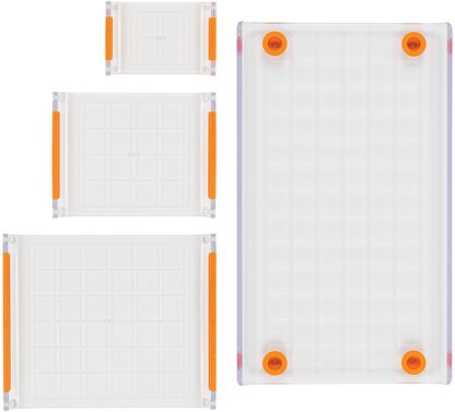 Fiskars-Stamp Block Set. The durable non-slip spring feet improve positioning and the side handles simplify lifting, improve visibility and keep fingers clean. Blocks nest for storage and travel. This package contains one 1x1 inch stamp block, one 2x2 inch s tamp block, one 3x3 inch stamp block and one 2x6.5 inch stamp block. Imported.