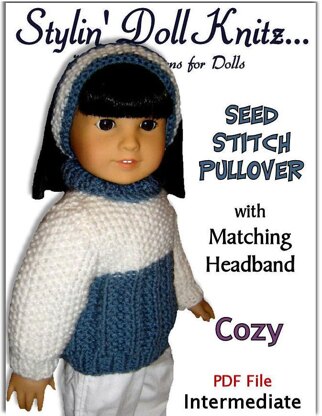 Pdf doll knitting pattern, fits 18 inch and American Girl dolls. Sweater and matching headband.