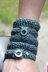 Soft-and-cosy wool meets hardware from your toolbox for these steampunk-inspired cuffs – it's a playful combination sure to appeal to your inner urban warrior. They're knit up as two sets of interconnected rings, then stitched together and adorned with washers. Silky Regenbogenschaf Meritence (wool/tencel) gives the mitts a lovely sheen, with a metallic glimmer from the Ito Tetsu (silk/stainless steel).