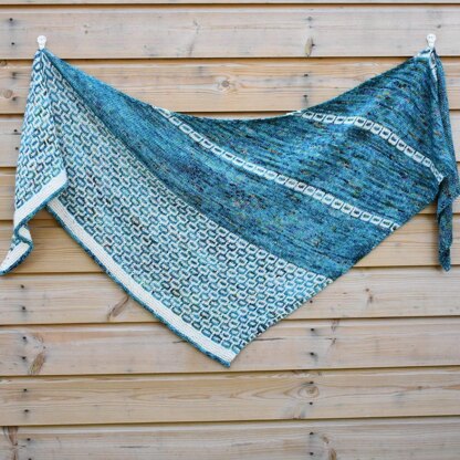 This shawl was inspired by my memories of my scuba diving days and my fascination with watching the silvery bubbles of air rushing to the surface through glorious blue waters. It’s an asymmetric triangle knitted sideways from a few cast on stitches. It is mostly knitted in stocking stitch with rows of slipped stitches to create the pattern and it’s finished with a contrasting i-cord bind off.