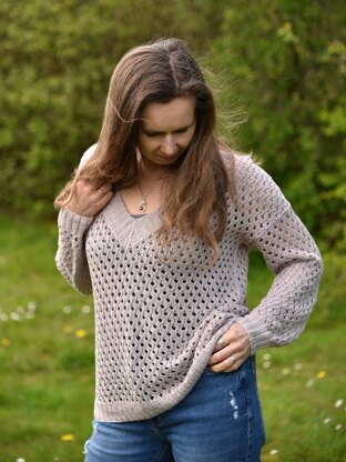 DESIGN OVERVIEW: Knitted with simple lacy stitches in linen yarn, this oversized sweater is designed with dropped shoulders, deep V-neck and boxy silhouette. The recommended positive ease is about 10-20 cm/4-8 inches. Front, back and sleeves of sweater are knitted separately bottom up on straight needles. After shoulder seams are closed, the stitches are picked up for neck finishing. Neck band is knitted on circular needles.