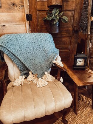 The subtle texture of the blanket reveals intricate pathways of diamonds that draw in your eye. The blanket is finished with tassels down the steeked or I-cord sides of the blanket.