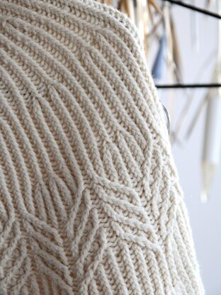 The sweater is worked from the top down with a round yoke, which is increased to create structure in the ribbing that ends in the straw pattern. Body and sleeves are worked separately.