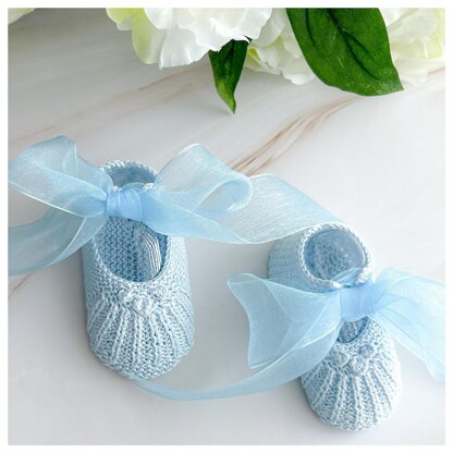 Construction: The booties are crafted in one piece starting from the sole and worked in garter stitch. The instep showcases a lovely combination of garter stitch and 1x2 ribbing stitch, creating a captivating texture. To add a touch of elegance, delicate bobbles are incorporated at the edge of the instep, giving these booties a unique and charming appeal.