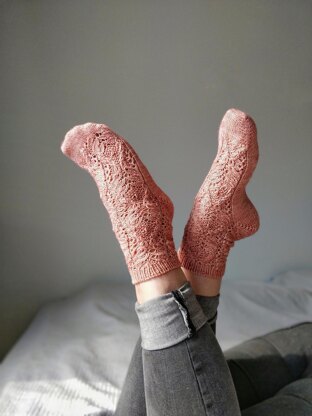The Fleuriste socks are knitted toe up with a short-row heel. The socks are started with Judy's magic cast on and are best worked with the magic loop technique. The heels are worked with German short rows, which are explained in this pattern. The Fleuriste socks look best in solid or slightly variegated colors for the stitch pattern to show in its full glory.