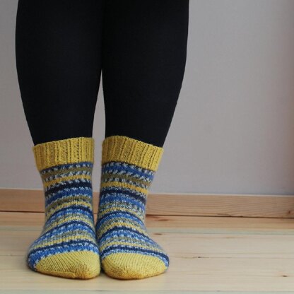 This easy knit is ideal as an introduction to sock knitting and great for knitting on the go. These afterthought heel socks can be knitted from the top down or the toe up, perfect for experimenting with direction. Choose your favourite self-patterning yarn, paired with contrast heels and toes for happy dancing feet.