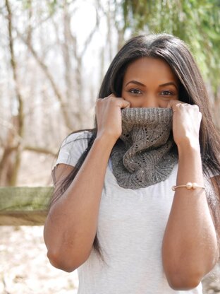 This handsome neckwarmer or cowl features a deeply etched motif with lots of movement for a bold, yet tailored lace look—all the more surprising when knit in a soft, cozy, tweed yarn. But don’t hesitate if instinct tells you to choose a fine lace yarn for a result with linework that stands out in stark relief on a sheer background fabric. A mix of simple and complex lacework keeps this project interesting for intermediate lace knitters who want to expand their knitting skills with a piece where the front of the work is always visible.