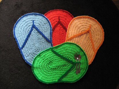 Quick and easy flip flops sandals placemats look great on any table! Designed to hold utensils in "toe bar".