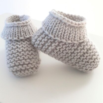 Flip Top Booties feature classic, plain garter stitch feet and a contrasting double-layer turn-back stocking stitch cuff. They are stylish but also practical, as the extra structure at the ankle ensures that the booties will stay on kicking little feet, without the use of uncomfortable ties.