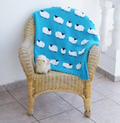 A very cosy and unique blanket/throw featuring a flock of fluffy sheep. Perfect for snuggling up on the sofa with your little one. Easy to knit in stocking stitch and a coloured intarsia chart to follow for the sheep. There is a twisted rib border around the blanket which you knit as you go along and this avoids the edges curling.