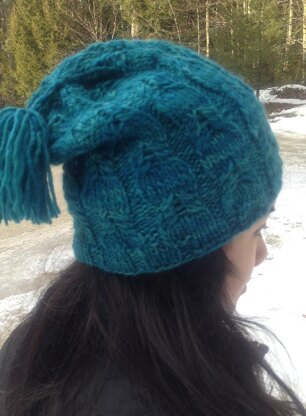 Quick to knit with a "Ponytail Tassel", floppy and warm. Use a soft, heavy worsted yarn with subtle color variations for a rich finished fabric.