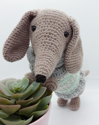 MATERIALS NEEDED - 3.5mm (E/4) and 4mm (G/6) crochet hooks, dk (light worsted) yarn in one colour for dog and 2 colours for jumper, plus a small amount of black for face details, 2 x 0.4" black toy safety eyes, polyester toy stuffing, yarn needle. Stitch markers.