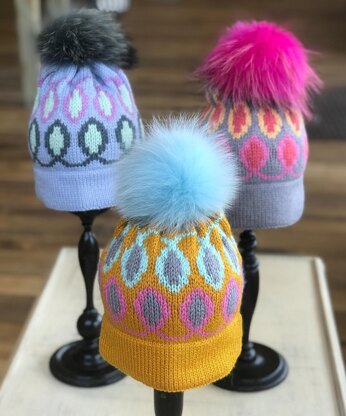 Florence is a stranded color-work hat that’s knitted using four contrasting colors. The pattern creates a bold, large scale design which makes a statement! It also has a hemmed brim to give it a crisp finished look.