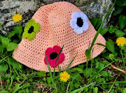 Eloise Summer Hat (Indian pink, light gray &peach colors Hat)This Bucket Hat is an easy project worked in one piece from top down, made in rounds: it starts with the crown section ,continues with the middle section and finishes with the brim. Flowers are crocheted separately and sewn on