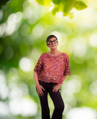 Knitted from the bottom up, first in the round and once separated for the armholes and neckline, it is knitted flat. The sleeve stitches get picked up and knitted in the round, they are also showing off the pretty lace border used in the bottom edge.