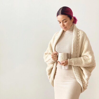 Cocoon is knit completely seamless and requires no sewing or grafting. You start working the pattern similarly to a (really wide) bottom-up sweater in the round up to the sleeves. They are added to the body with a provisional cast on. Then, front and back pieces are worked flat separately and joined using three needle bind off. The cocoon is finished off with the sleeve cuffs knit in the round.
