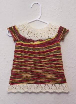 A delightful bottom-up, round-yoke A-line dress for the special little girls in your life, Florisa starts with a leafy hem, then transitions into a stockinette section with simple shaping…perfect for those fun handpainted yarns and coordinating trim colors. Yoke decreases are incorporated into the lacy detail at the collar.