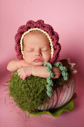 This is a PDF crochet pattern for a sweet rounded back flower bonnet in 4 sizes. Have you seen those huge flower bonnets that are so cute....but thought they weren't practical for everyday use? Well here is a practical option that is not only adorable for photos, but something baby can wear every day. The pattern comes with two options for ties, corkscrew or plain, and the length is adjustable so you can make them short for safety reasons, or longer for photo prop bonnets.