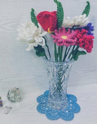 Crochet Pattern for a beautiful Bouquet of Flowers, being Gerbera, Chrysanthemum, Tulip and a Long Leaf. Pattern includes written instructions and reference photos. 6 pages. 30+ photos.