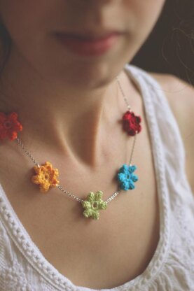 How lovely is this colorful necklace? Each little puffy flower is then joined together using bits of chain and jump rings. Try a long necklace, crochet all the flowers in black, or even make earrings with this versatile flower pattern!